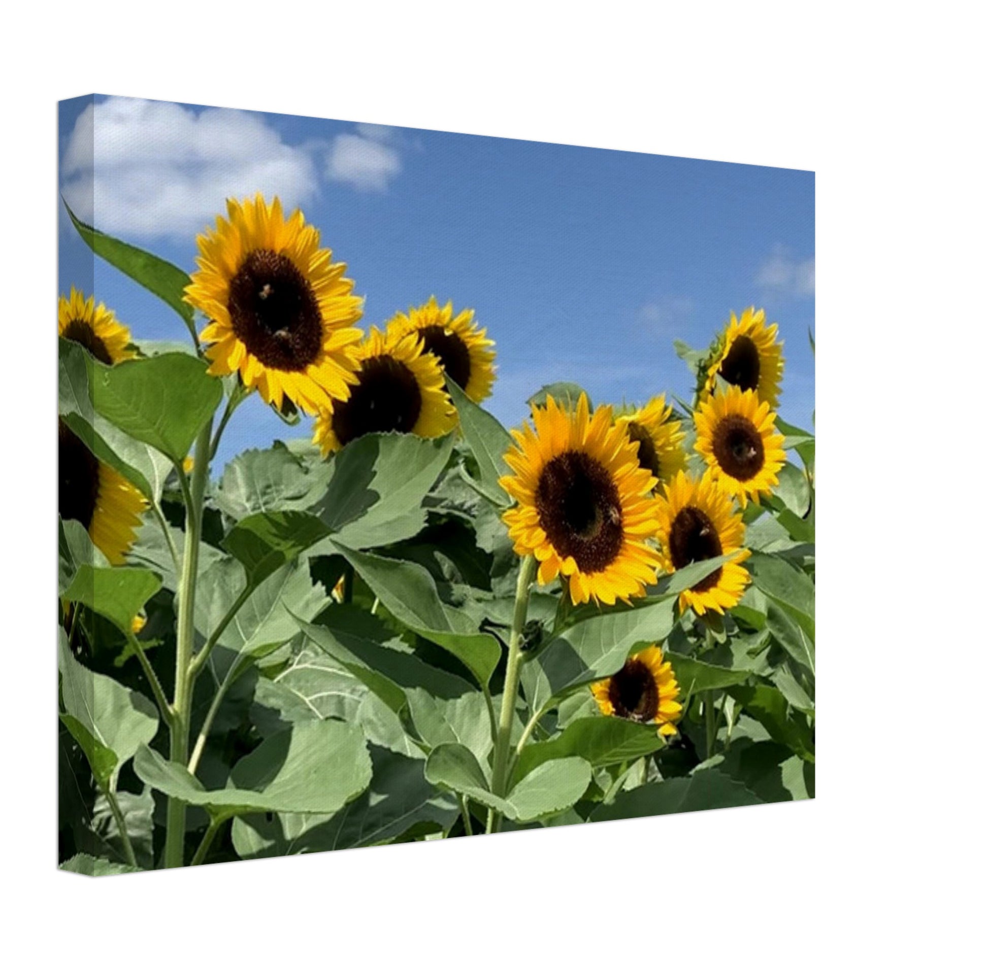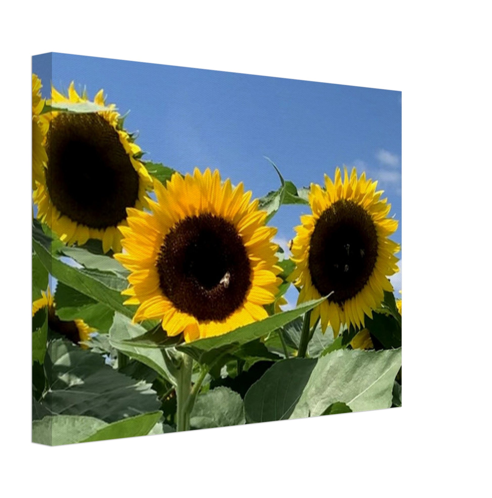 This beautiful sunflower print will brighten absolutely any room you decide to hang it in. The vibrant yellows against the sky blue makes you feel like you are staring at a real flower. The canvas texture enhances the image's natural look and feel, creating a truly immersive art experience.